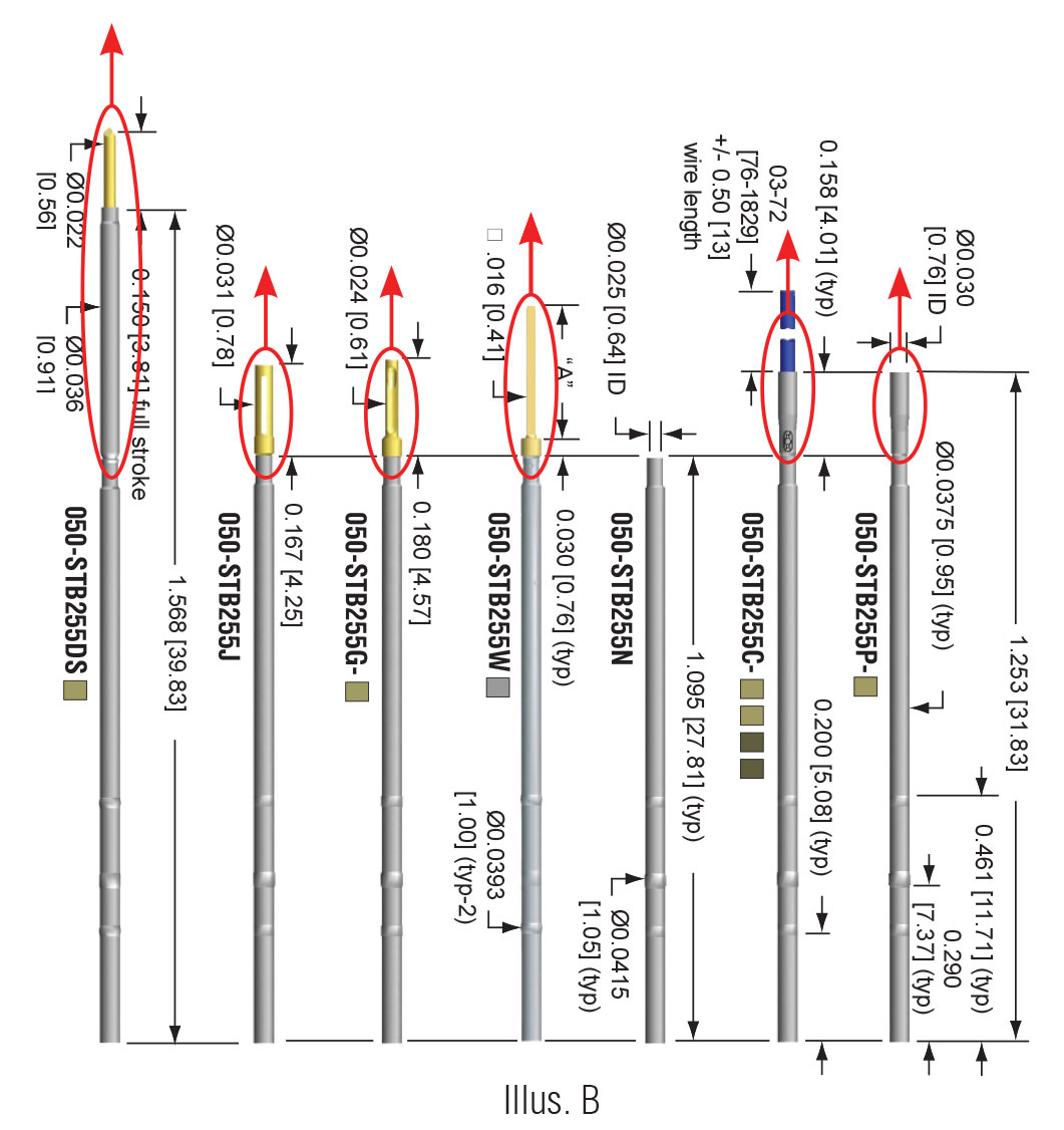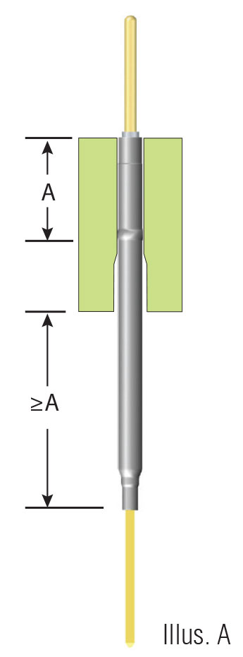 对于安装在丙烯酸或类似塑料的025-16系列针套,您可以通过安装板,用尖嘴钳轻轻拉动预先连接的电线或针套主体,将针套拆除。如果用尖嘴钳拉动针套,通常最好将探针留在针套中,因为探针有助于针套抵抗挤压。如果电线缺失,可以用平推器直接向下推针套背面,迫使针套向上穿过安装板。也可以使用直径为0.021[0.53]的量规销。将其放在针套顶部,然后轻轻地将针套推出。