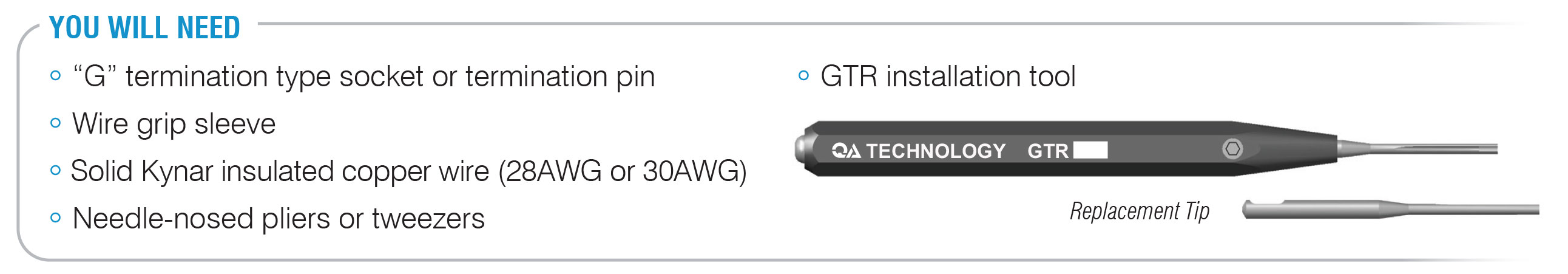 Para instalación de sujetadores, tapones de alambre o enchufes, use un alambre solido de cobre aislado Kynar, sin forro de 0.120[3.05] (alambre trenzado no es recomendable). QA ofrece removedores de aislado de alambre (WS) preestablecidos a esta longitud y disponibles en tamaños 28AWG y 30AWG para este propósito.