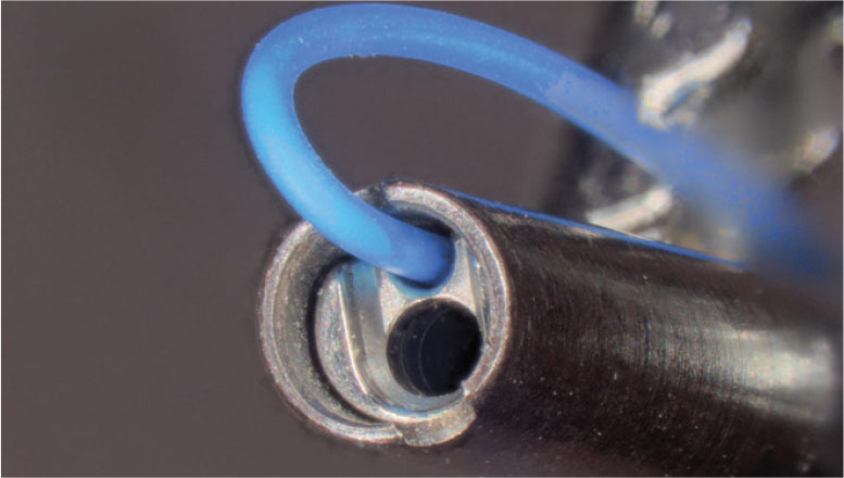 Meta el alambre y la manga en el canal de la herramienta de instalación (GTR) y deslícelos hasta que la manga llegue al fondo en el hombro interior de la herramienta.